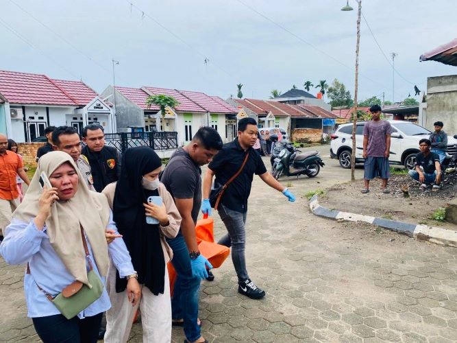 Anggota kepolisian mengevakuasi jasad Fitra (35), seorang pengusaha muda, ditemukan tak bernyawa di rumahnya. -kejarkabar.com-