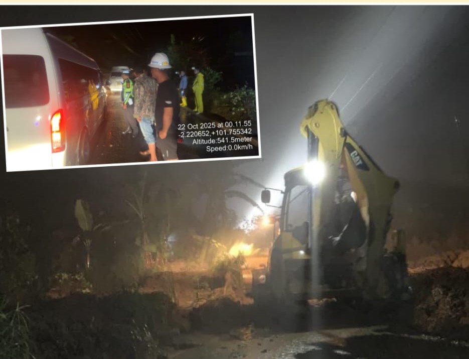 KERINCI, KEJARKABAR.COM – Akses utama Jalan Nasional Kerinci–Bangko lumpuh total akibat longsor besar yang terjadi di Desa Muara Hemat, Kecamatan Batang Merangin, Selasa malam (21/10).
